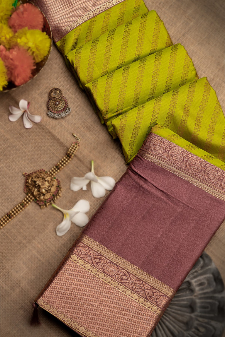 Mandir Light Green & Light Brown Kanchipuram Cross Lines Saree