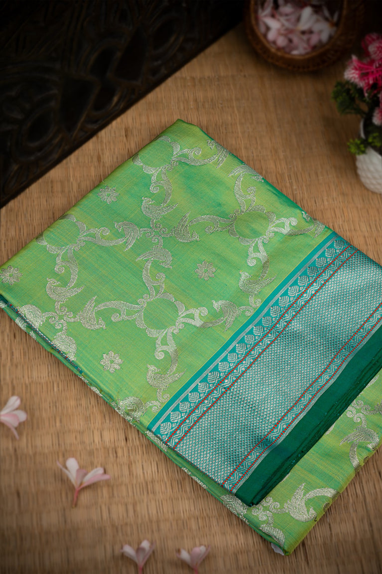 Mandir Light Peach & Green Kanchipuram Floral Jaal Saree