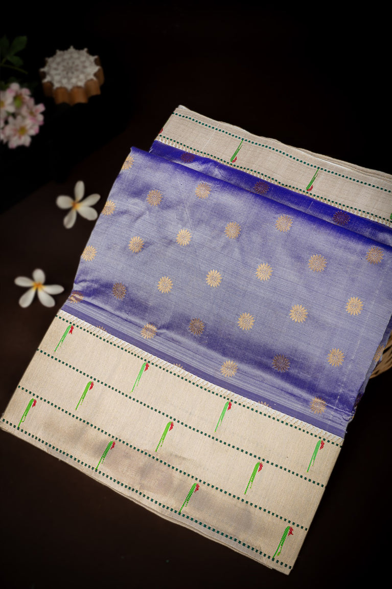 Mandir Light Grey & Navy Blue Kuppadam Buttis Saree
