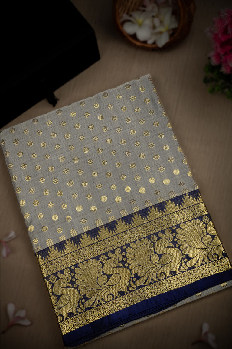 Mandir Light Grey & Navy Blue Venkatagiri Buttis Saree