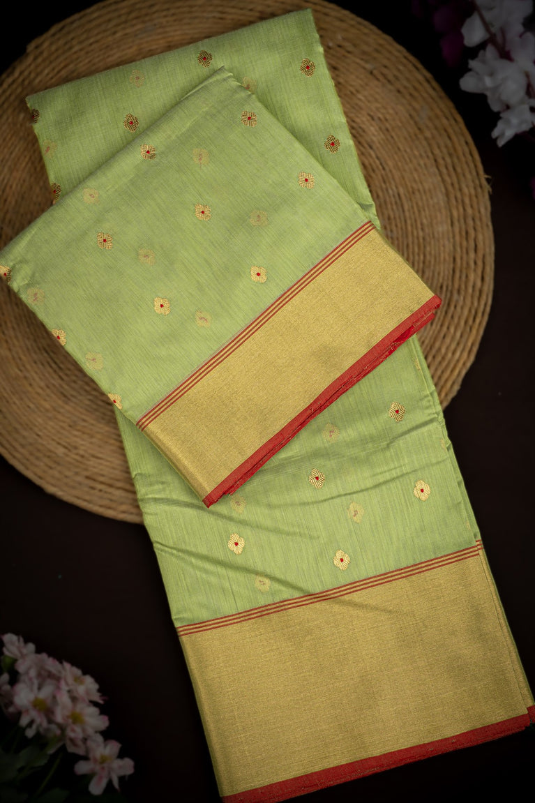 Mandir Pale Lime Yellow & Maroon Chanderi Buttis Saree