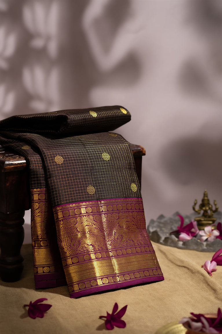 Varamahalakshmi Black & Magenta Kanchipuram Checks And Buttis Saree