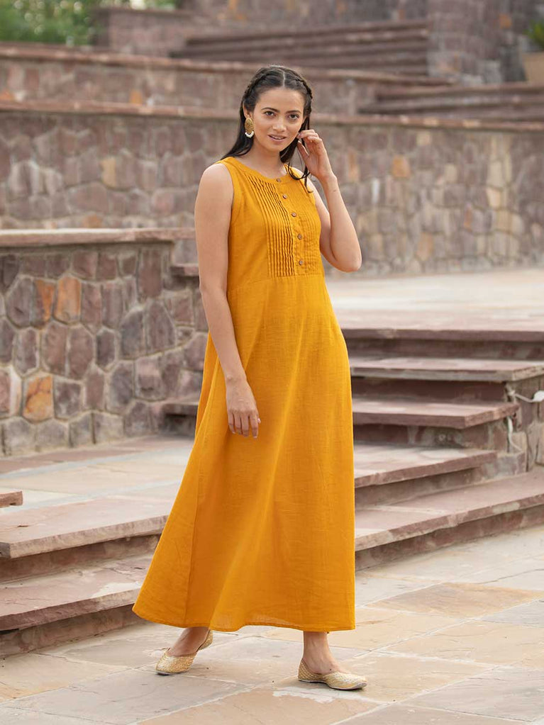Mustard Yellow Sleeveless Cotton Pintuck Dress