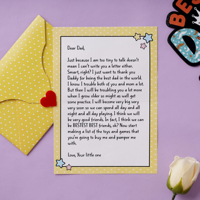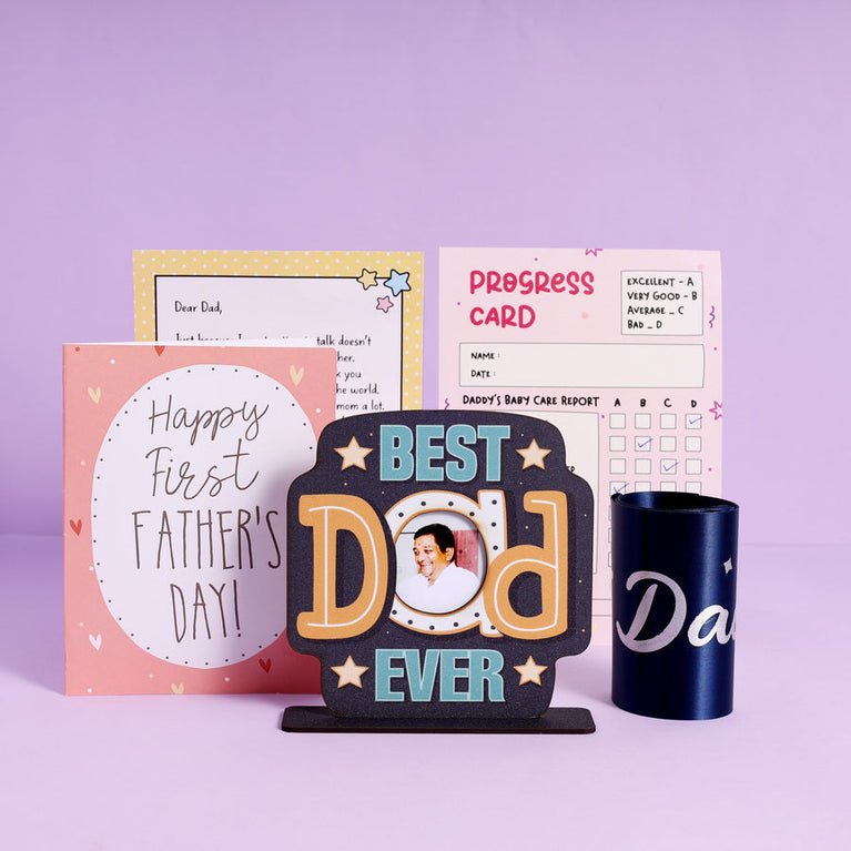 Know someone who just got promoted to 'Dad', and he’s already the best at it? This First Father’s Day Hamper is a warm little hug for the new superhero.The hamper includes:Letter for New Dad - Want to surprise a new dad who can’t stop being excited about the baby? Gift him an outrageously cute letter written by his little baby! This gift is adorable enough to make him melt like a slab of butter.Report Card for New Dad - For the father who's giving his all, here’s a hilariously cute New Dad Report Card to evaluate his baby-handling skills. Whether he's acing the diaper duty or needs a little improvement in learning burping techniques, this report card is a sweet and funny way to tell him that he is doing great!A Sash - Fathers are the real superheroes! Make a new dad feel like one with this adorable world's best dad sash.Best Dad Ever Table Top - An intricate work of art to adorn the new dad's bedroom/living room with. Made with lots of love and creativity, this gift tells the new dad everyday that he is the best dad ever! And, you know the best part? You can customise the table top with their favorite picture. Go ahead, and make their day. First Father's Day Card - Some moments deserve to be remembered forever. Celebrate a new dad’s first Father’s Day with a card that makes the moment even more special. Specifications -Size of the Hamper Box : 14 x 17.8 x 7 cmsSize of the Letter for New Dads : 14.8 x 21 cmsBest Dad Sash : RegularSize of the Report Card for New Dads : 14.8 x 21 cmsSize of the First Father's Day Card : 12.5 x 15 cmsSize of the Table Top : 12.7 x 13.7 cms