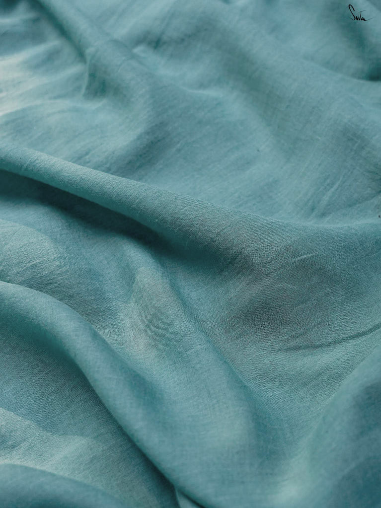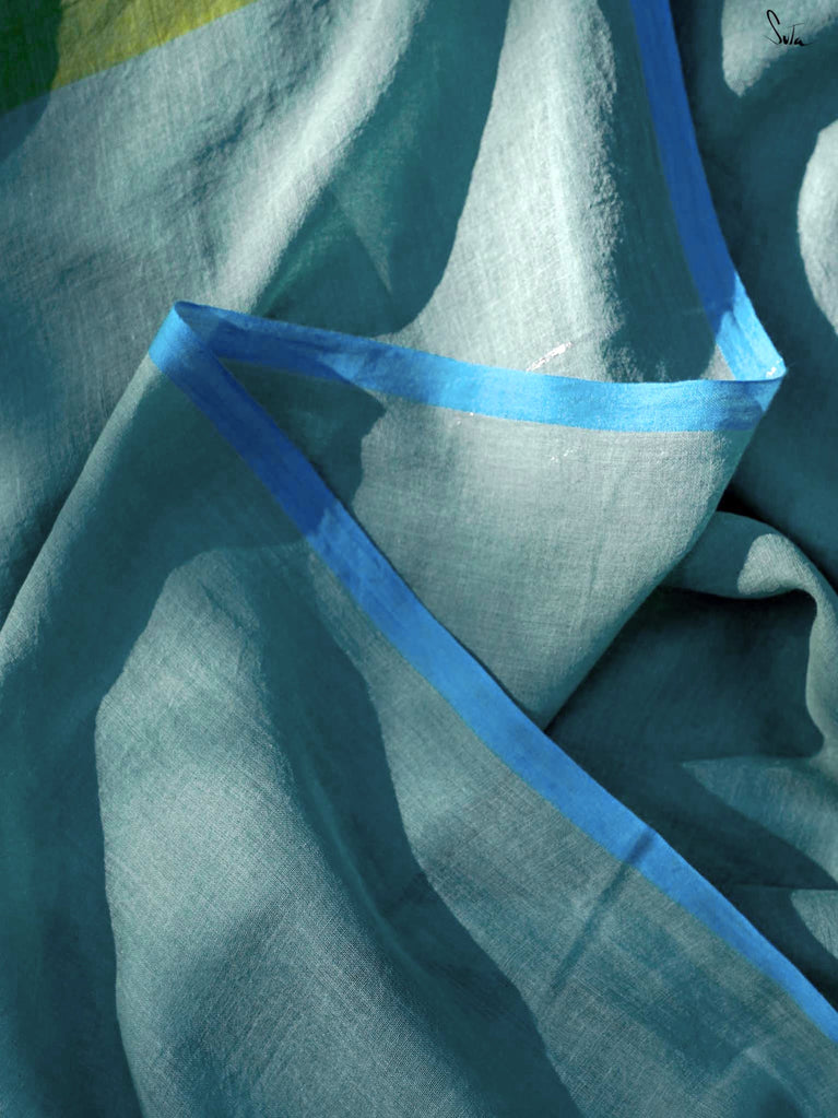 Like silver linings- bright and hopeful, this light blue mul cotton saree is all about easy elegance. The contrast selvedge adds a touch of character, and the zari lines on the pallu catch the light most softly. A pop of lime green and matching tassels bring in a fresh, summery surprise. Perfect for daytime events, office parties, or lunches that turn into laughter-filled afternoons.
