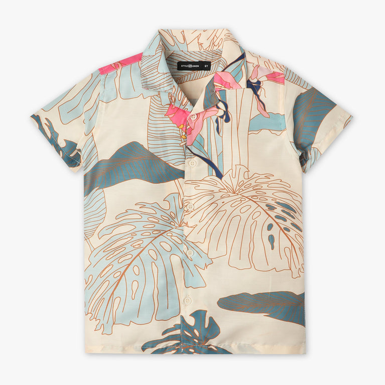 Experience the perfect blend of comfort and style with our Boys Regular Fit Printed Camp Collar Half Sleeve Shirt. Crafted from soft, breathable rayon, this shirt ensures your little one stays cool and comfortable all day long. The playful printed pattern adds a touch of fun, making it a versatile choice for any occasion.