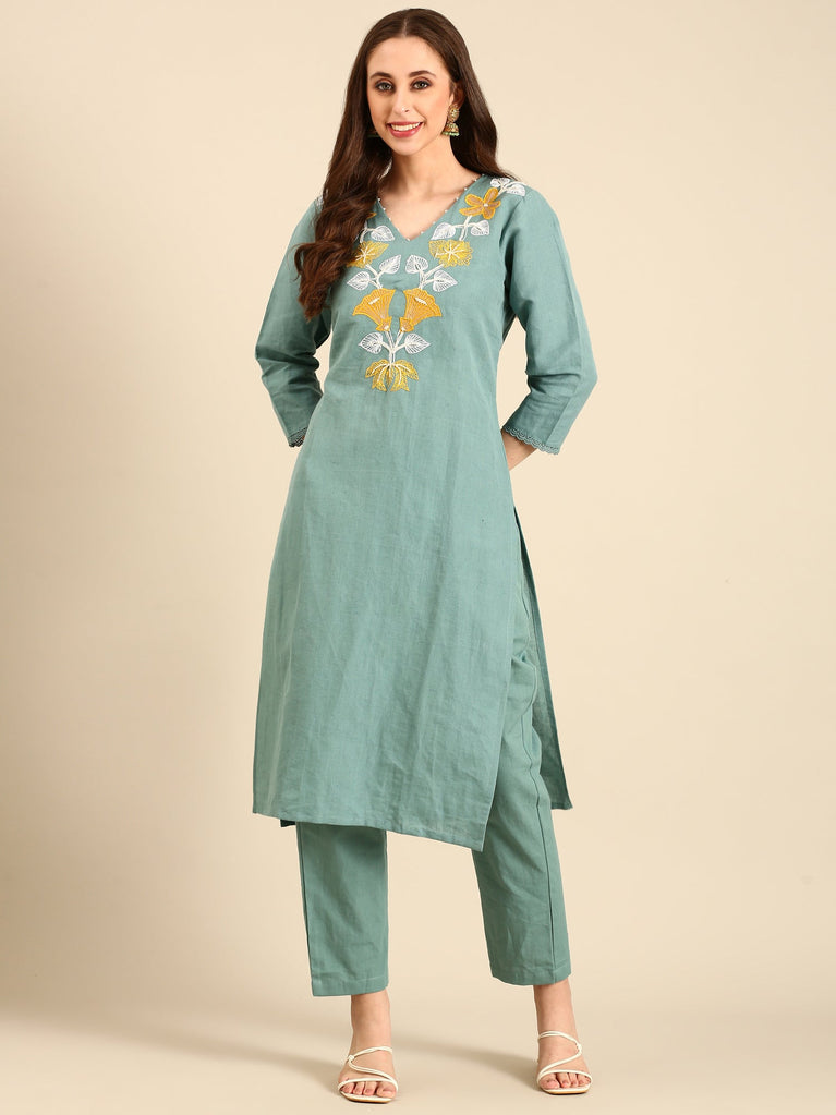 Elevate your wardrobe with this mint green linen two-piece suit set, featuring a sea green linen fabric V-neck patch intricately adorned with delicate aari embroidery. Crafted for both comfort and style, this ensemble brings a subtle yet striking elegance to your look, perfect for any occasion where grace meets tradition. The breathable linen fabric ensures you stay comfortable while the detailed embroidery adds a unique handcrafted touch, making this suit set a timeless addition to your collection.