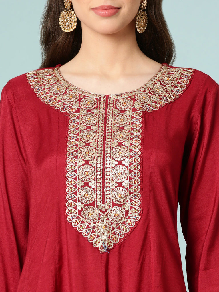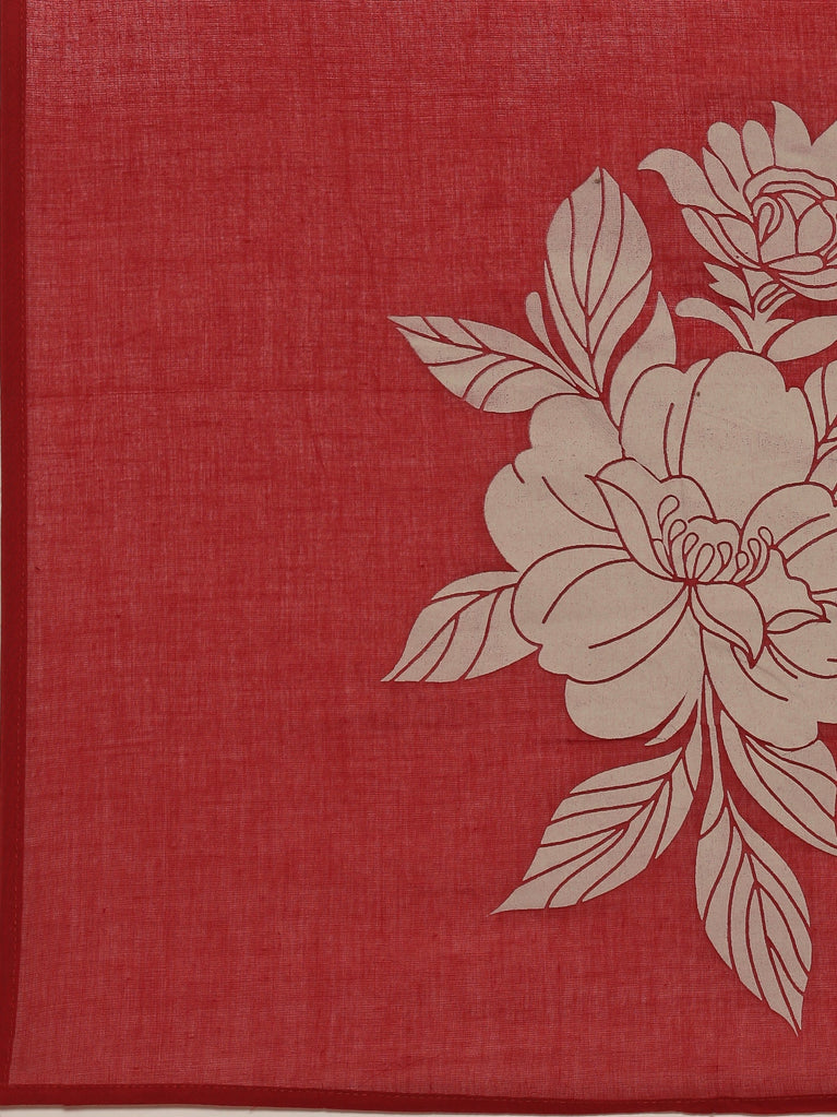 Maroon Cotton Print With Embroidery Three Piece Suit Set