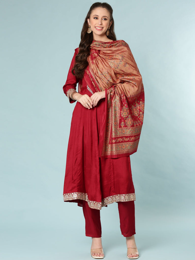 Elevate your ethnic wardrobe with this stunning Maroon Dola Silk Three Piece Set. Crafted from luxurious dola silk, this ensemble features a rich maroon hue that exudes elegance and sophistication. The three-piece collection includes coordinated pieces designed to work beautifully together, offering you versatile styling options for weddings, festivals, and special occasions.