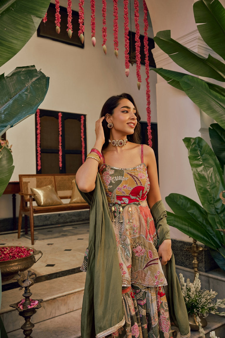 Mehadi Green Silk Zari Floral Embroidered Three Piece Set