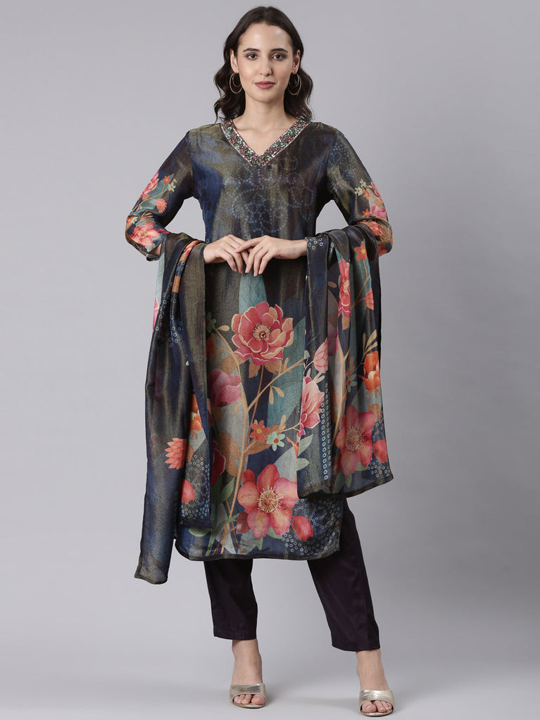 Black Vichitra silk aari embroidered 3 piece anarkali set