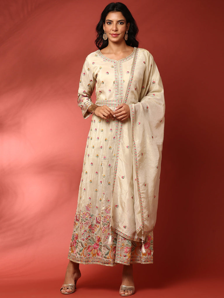 Cream crepe hand embroidered three piece suit set with Floral dupatta
