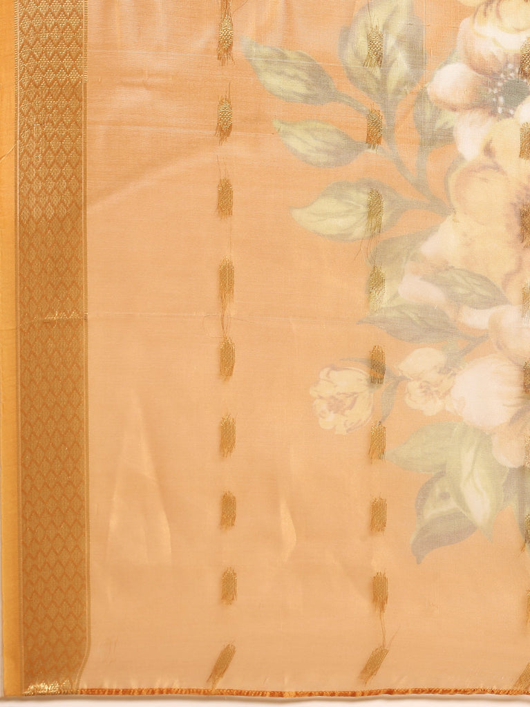 Elevate your ethnic wardrobe with this cream three-piece Anarkali set, crafted in delicate tissue fabric. Adorned with intricate floral thread work, it brings a refined elegance to any occasion. The lightweight fabric ensures comfort while the detailed embroidery adds a timeless charm, making it perfect for festive gatherings and special events. Embrace grace and style effortlessly with this exquisite ensemble.