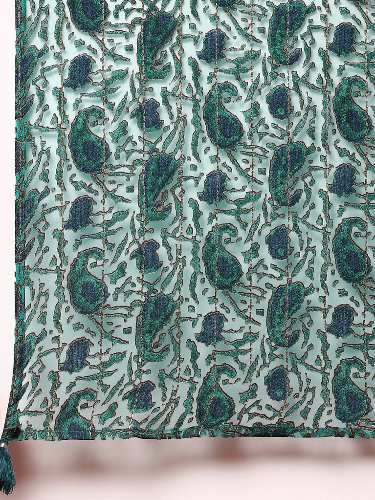 Elevate your traditional wardrobe with this green organza three-piece set featuring delicate printed patterns and intricate embroidery. Lightweight and breathable, this ensemble combines elegance and comfort, perfect for festive occasions or special gatherings. The coordinated pieces offer versatility while ensuring you stand out with subtle sophistication.