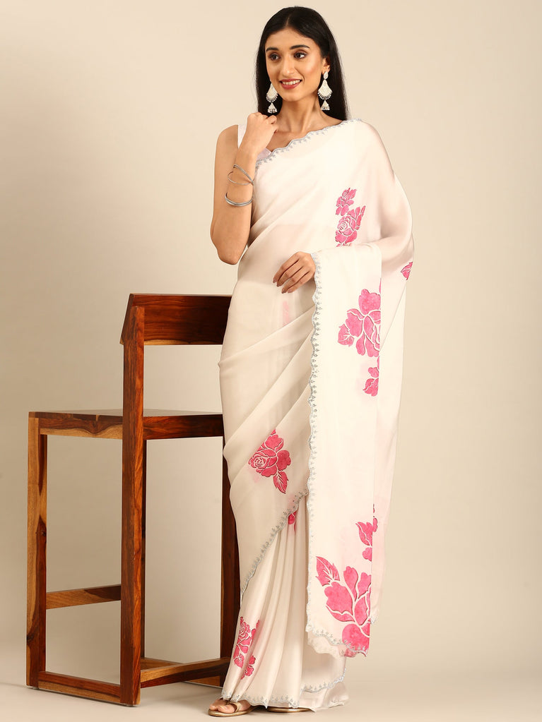 Cream satin saree with pink printed motifs with swarovski embroidery