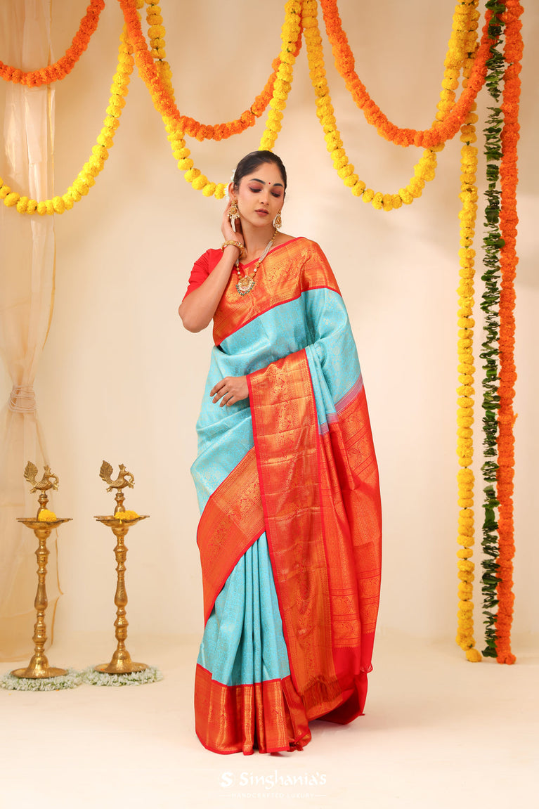 Intricately woven, this regal Cyan Blue Kanjivaram Silk Saree features ornate gold zari woven floral jaal designs. The contrasting red big border with peacock and diamond pattern accnetautes the look. Wear it on wedding and festive occasions.