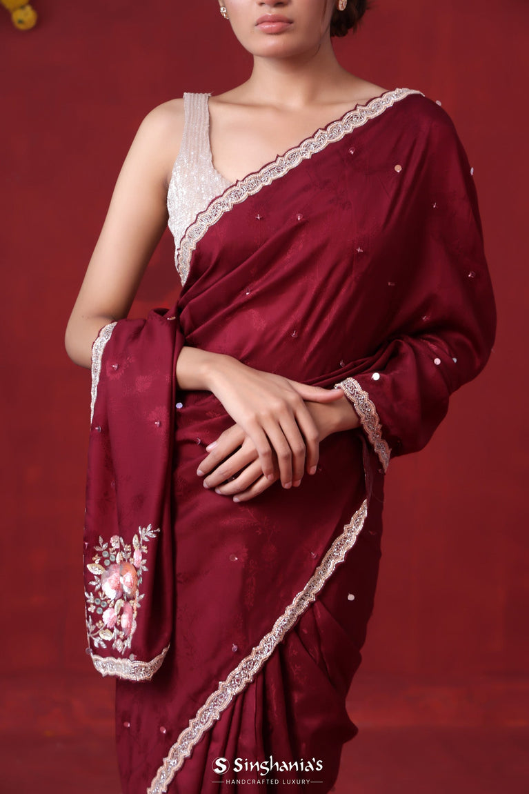 Embrace elegance with this handcrafted Modal Satin saree in Crimson Maroon. Suitable for festive wear, office wear, or weddings, the saree features floral buttis and a small floral border, adding a touch of grace to your attire.