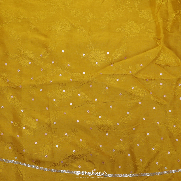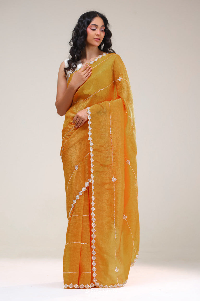 A saree that glows as beautifully as you do! This dahlia yellow saree is woven with tissue fabric, creating a soft, radiant shimmer. Accentuated with glass beads and stones, stripes embroidery, it’s an excellent choice for festivals, receptions and grand celebrations.
