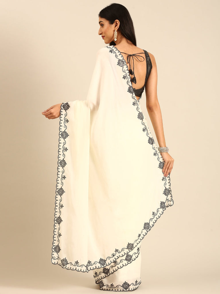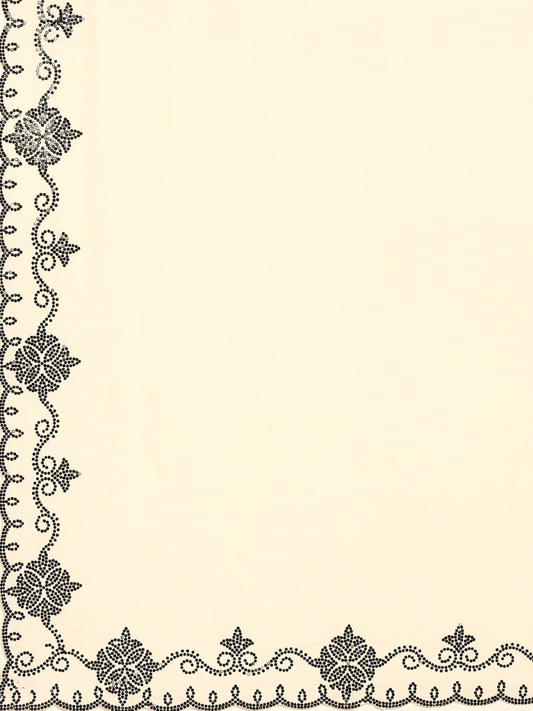 This cream satin saree features an elegant Swarovski-embroidered border, adding a refined sparkle to its smooth, lustrous fabric. Ideal for formal occasions, its delicate craftsmanship combines classic sophistication with subtle glamour, ensuring you make a graceful statement with every wear.