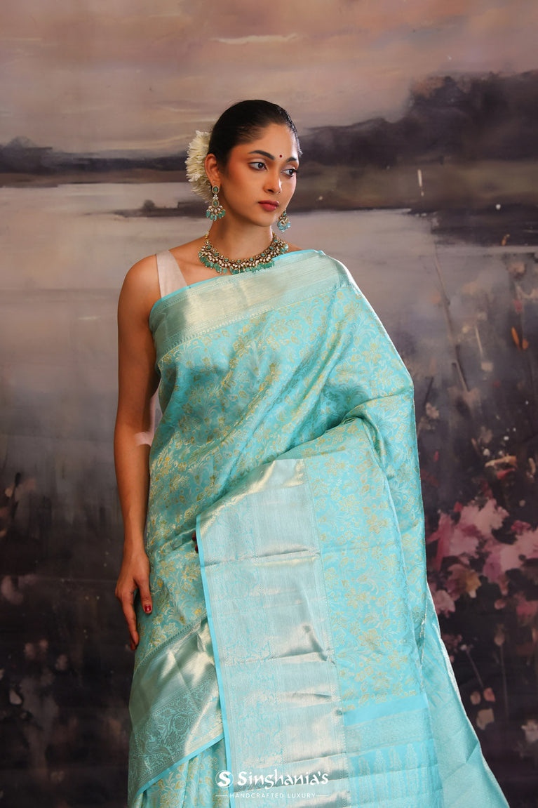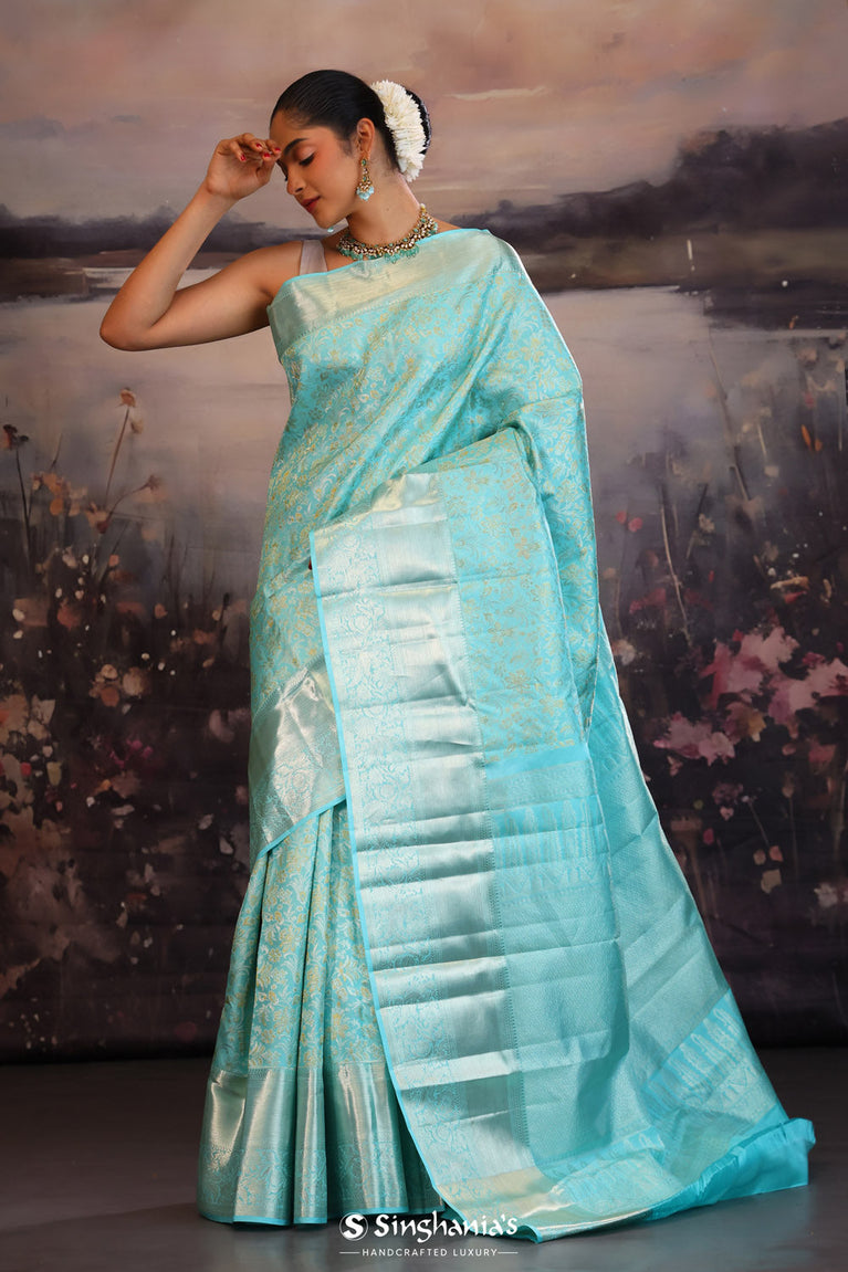 Cyan Blue Kanjivaram Silk Saree With Floral Jaal