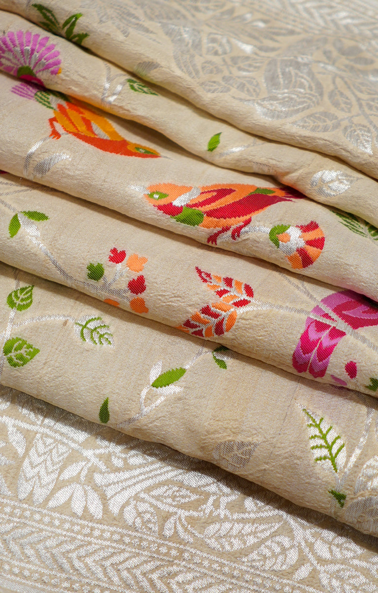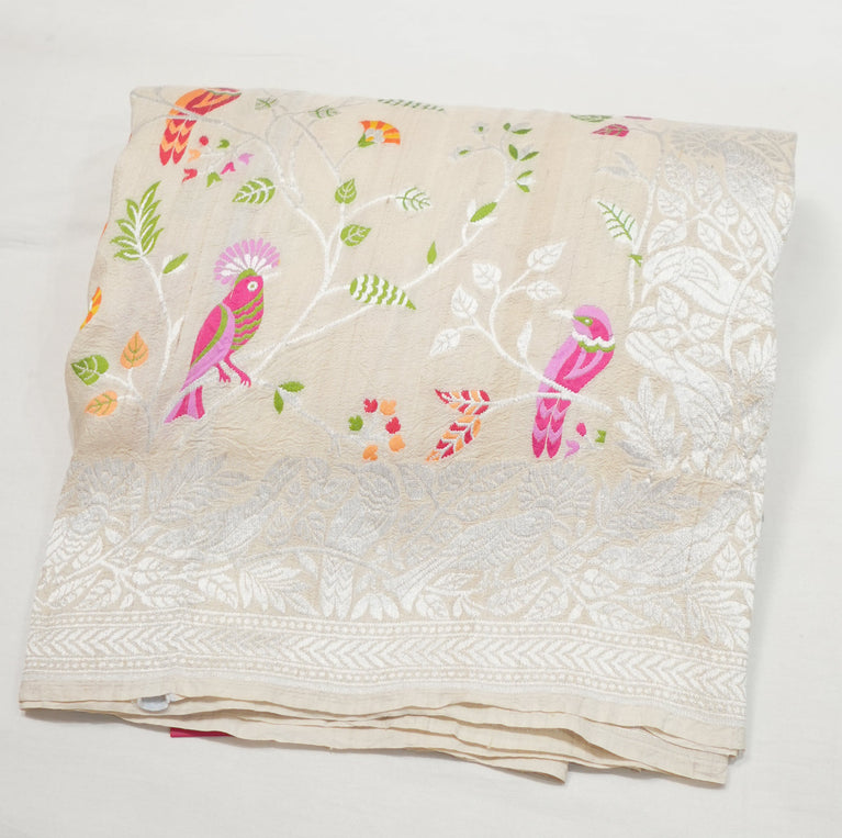 Cream Pure Handloom Tussar Saree With All Over MultiColour Birds