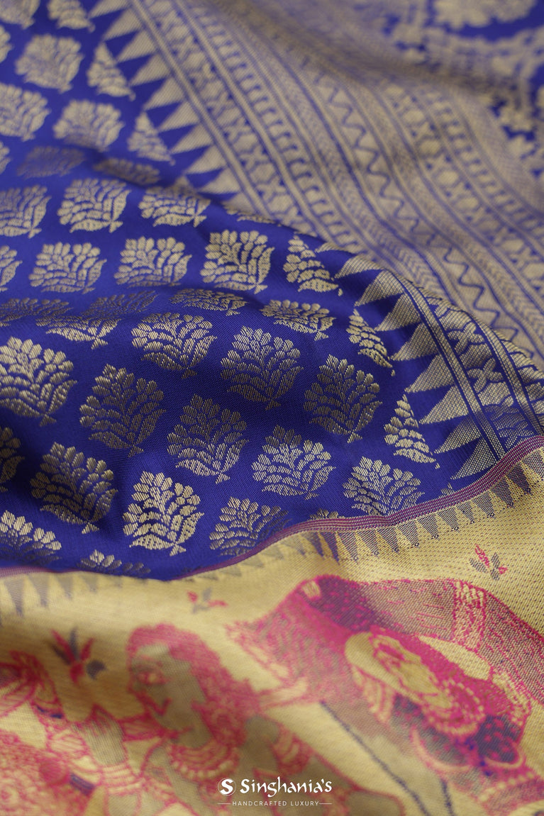 A rich Egyptian Blue Kanjivaram Silk Saree featuring meenakari work and gold zari motif all over the body, and a small border with tilfi embellishments featuring human life. A perfect choice for festive wear and wedding parties.