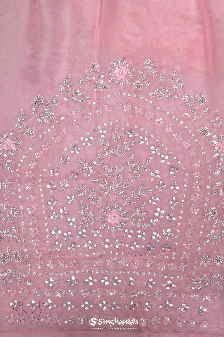 A delicate organza saree in a soft flamingo pink shade with sequins and glass beads embroidery all over. The saree is accentuated with a small embroidered floral patterned border, making it ideal for festive and wedding events.
