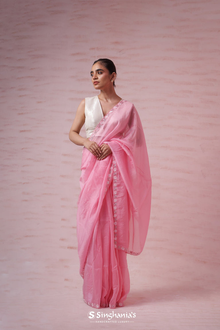 Flamingo Pink Organza Saree With Hand Embroidery