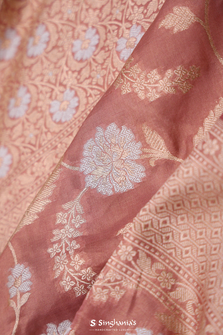 A serene dusty pink banarasi silk saree featuring intricate floral jaal patterns in gold and silver zari weaving. The elaborate border and rich pallu design make it suitable for wedding functions and festival wear.