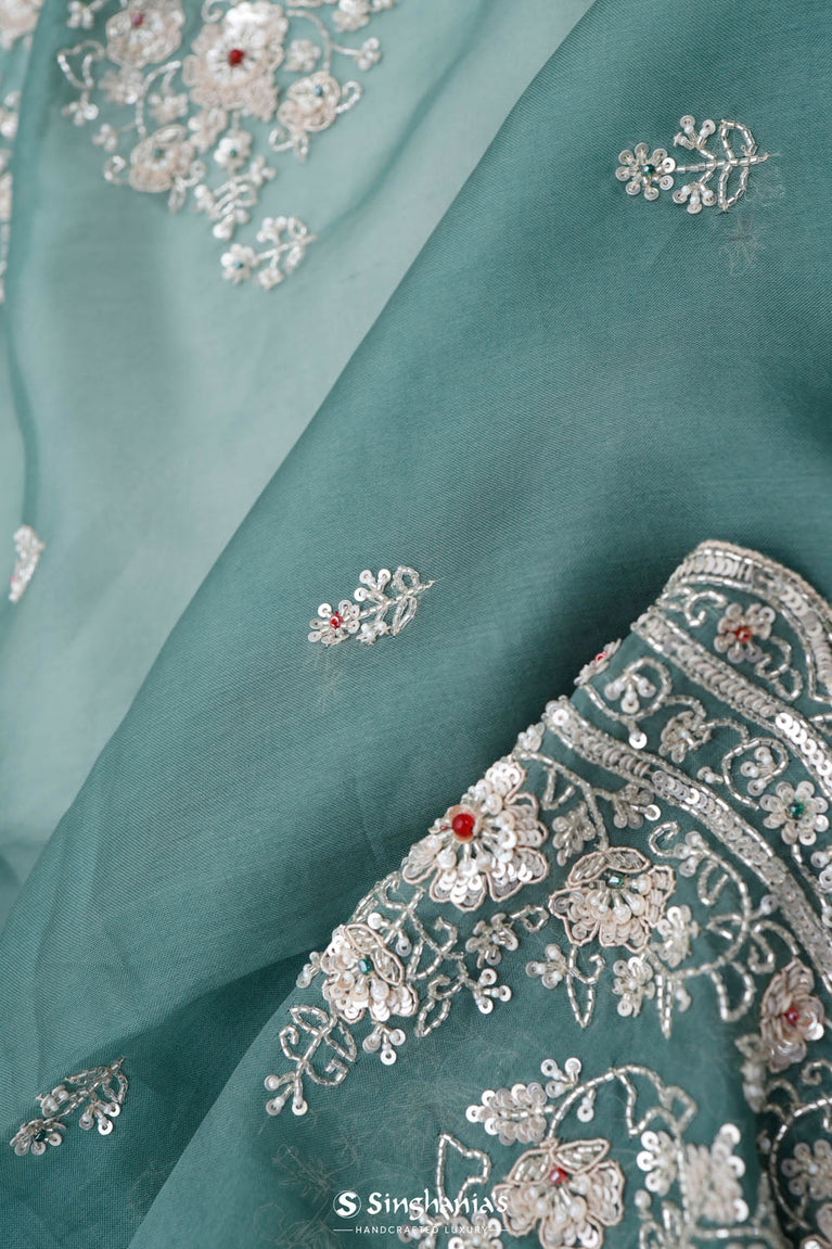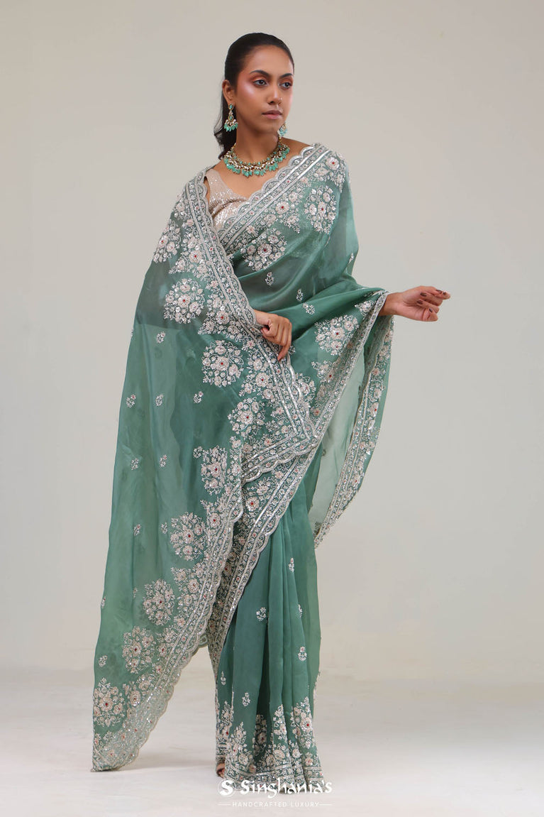 A soothing eucalyptus green saree with an organza base, which features floral buttis on the body. Accentuated with delicate floral embroidery in sequins and glass beads, with scalloped border edge, that adds to the whole look. Suitable for festive and wedding parties.