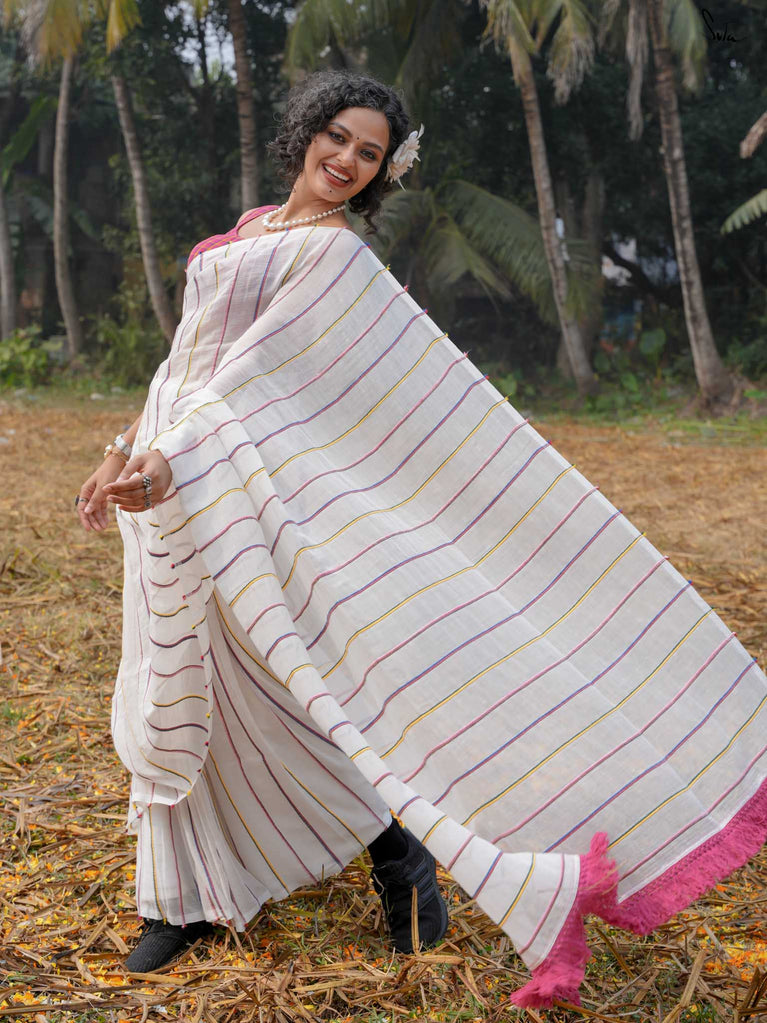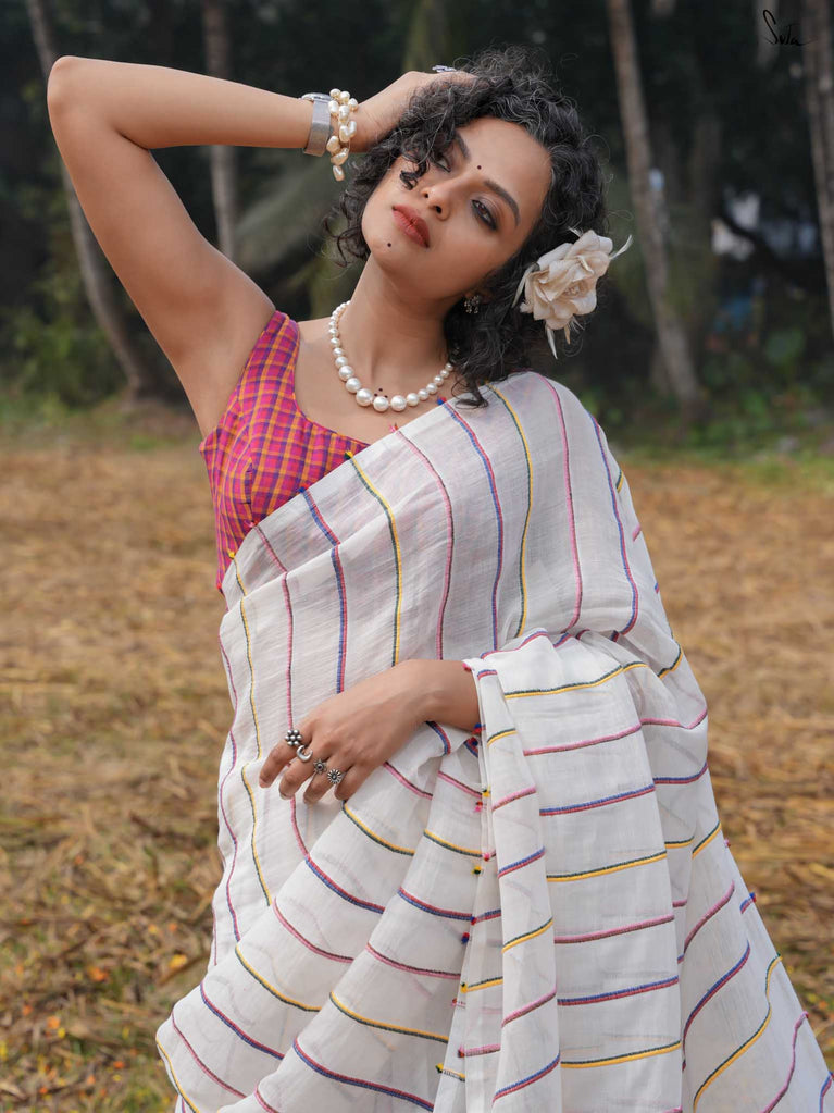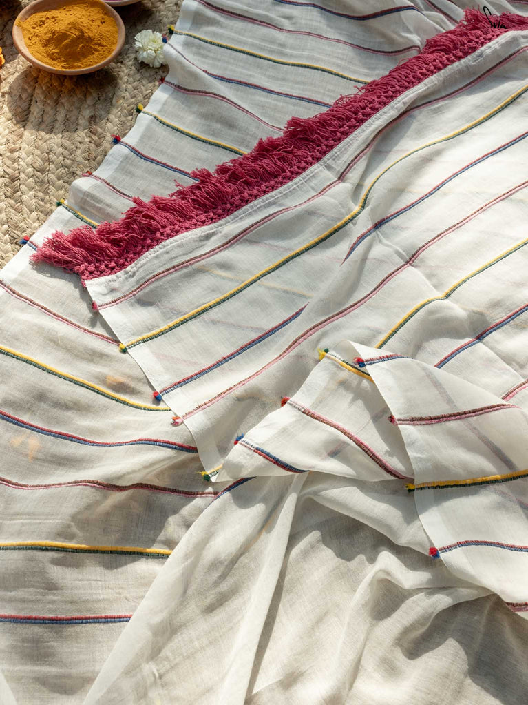 A rainbow of tradition, this multicolored mul khesh saree captures the essence of Holi in its vibrant, handwoven stripes. Each handwoven thread tells a story of craftsmanship passed down through generations, woven with care and joy. The playful jhalar tassels, like droplets of color, swing with every step, carrying a mischievous wink that only the festival of colors can bring. Wrapped in this saree, you’re wearing the spirit of an age-old tradition, reimagined for today’s celebrant.
