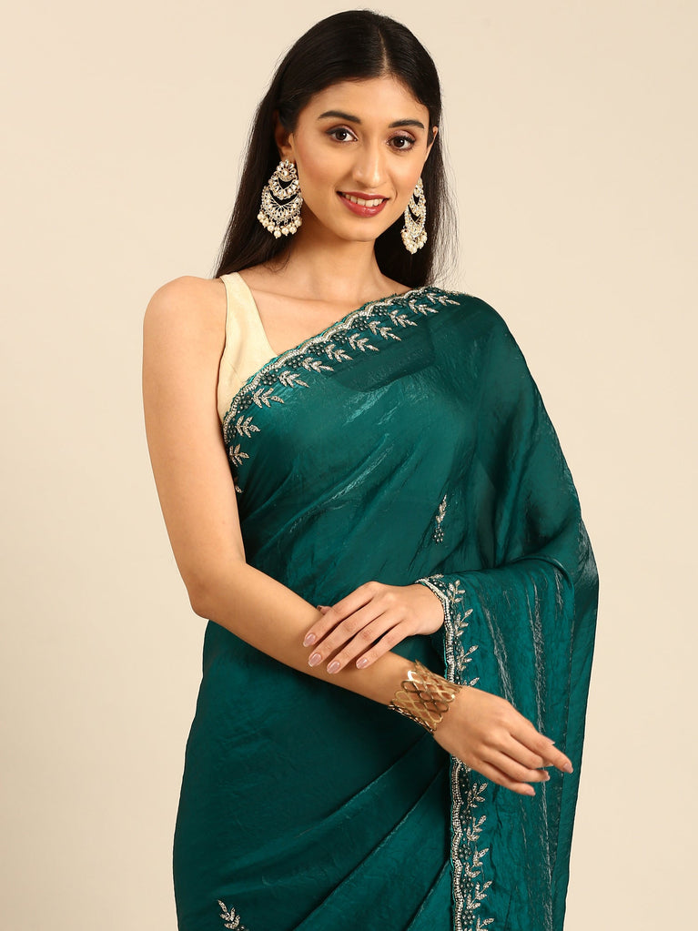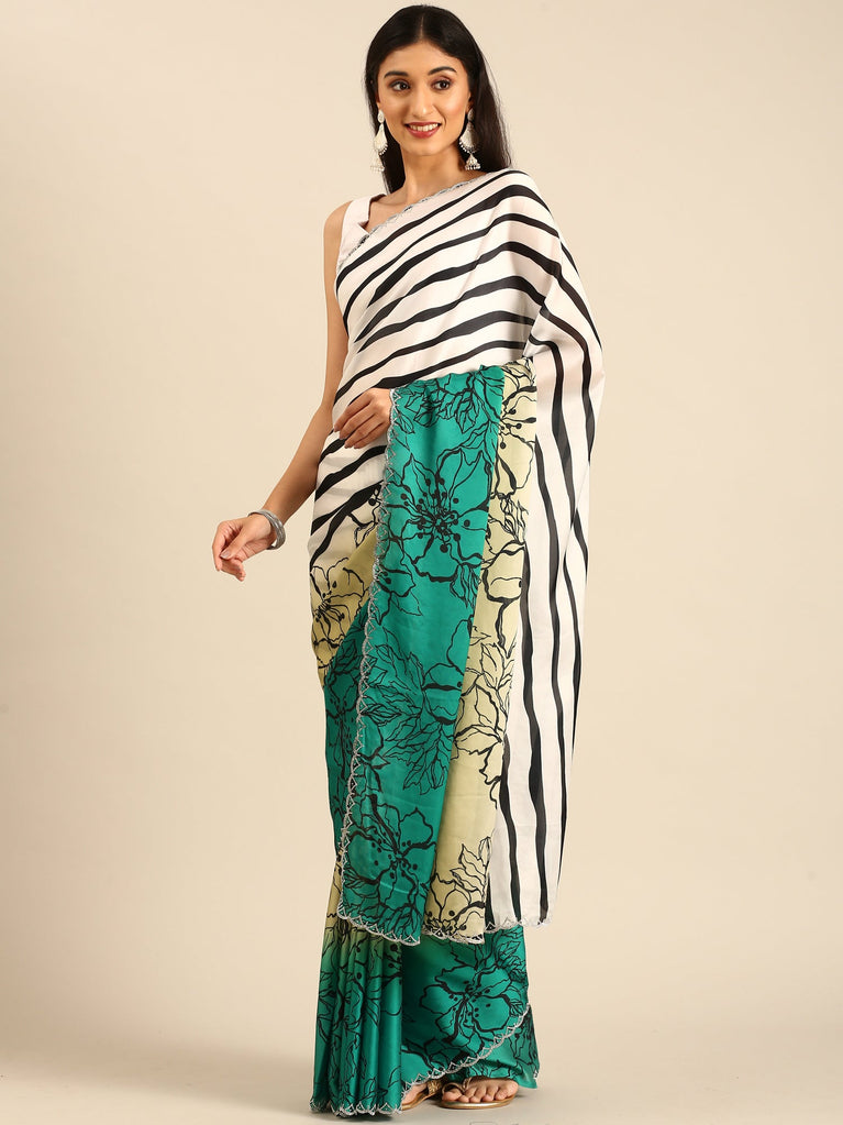 Green Satin printed saree with Swarovski embroidery