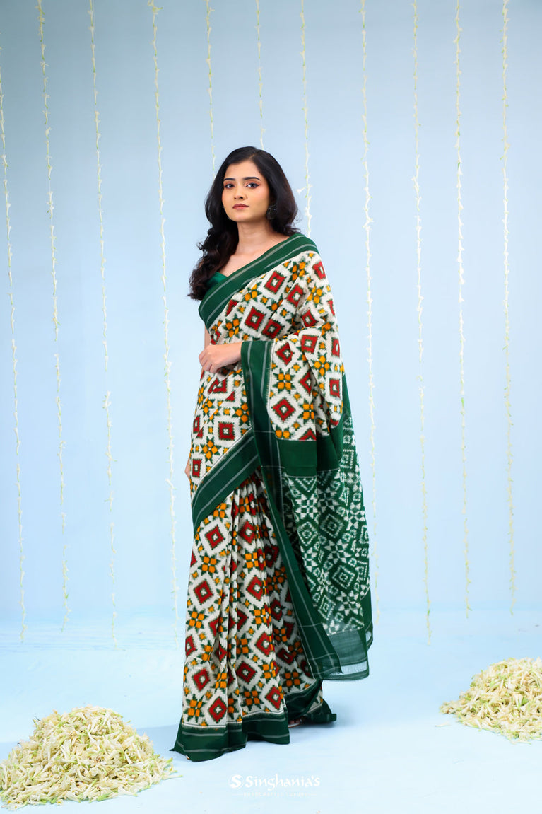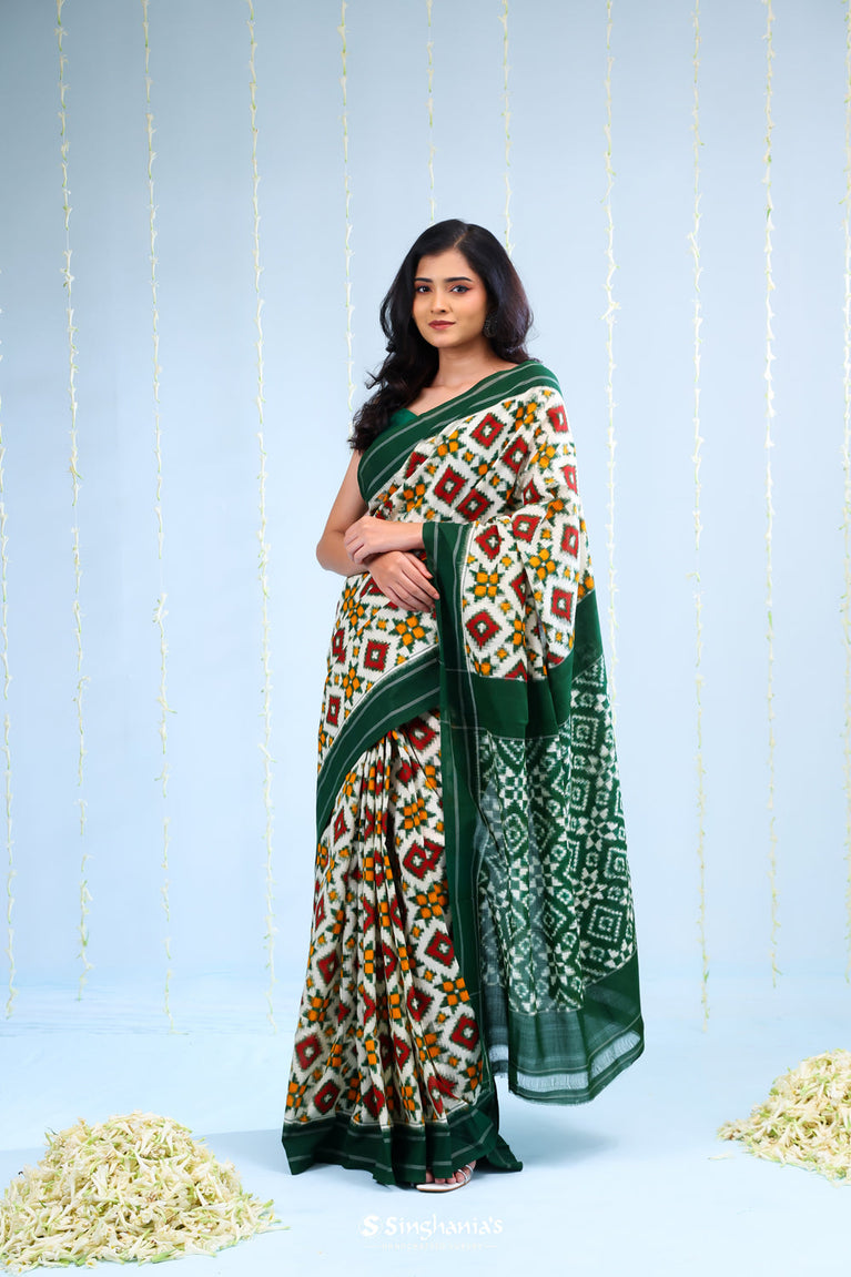 Green White Ikkat Cotton Saree With Contrast Border