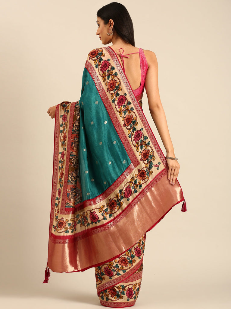 Green Banaras Silk Saree With Kalamkari Printed Border