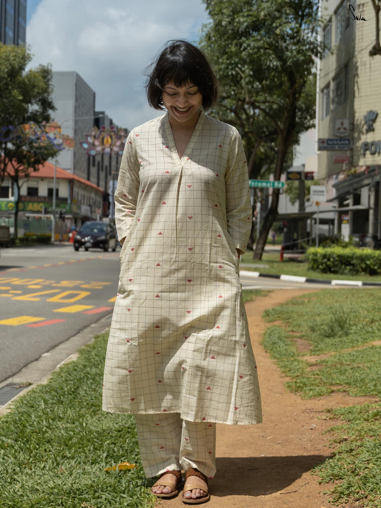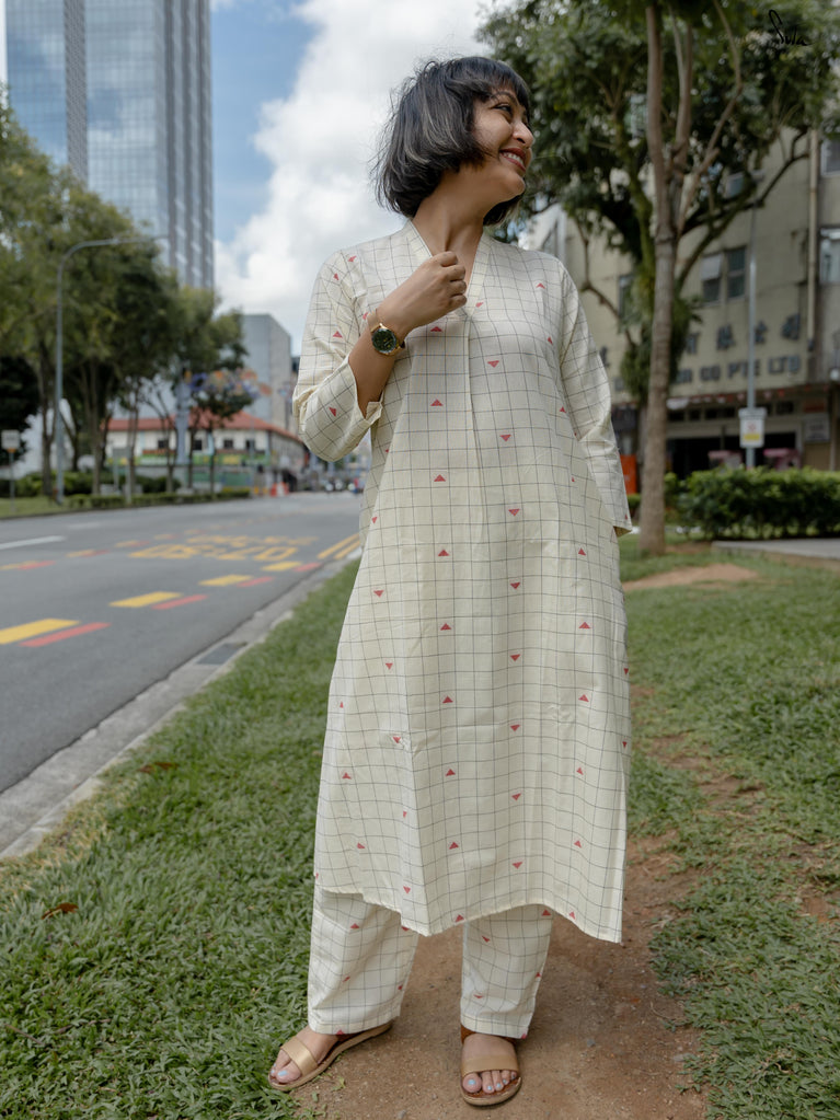 Soft and serene, Creamy Checks is a white cotton co-ord set that feels like a gentle breeze. The boat neckline and pockets add modern flair. Perfect for brunches or minimalist gatherings. Style with sleek gold accessories and understated flats.
