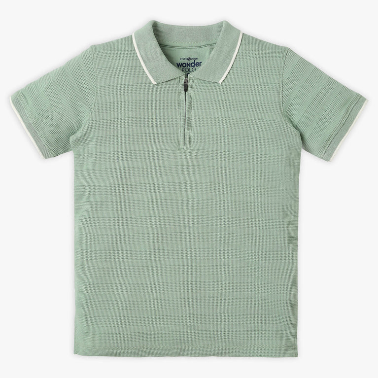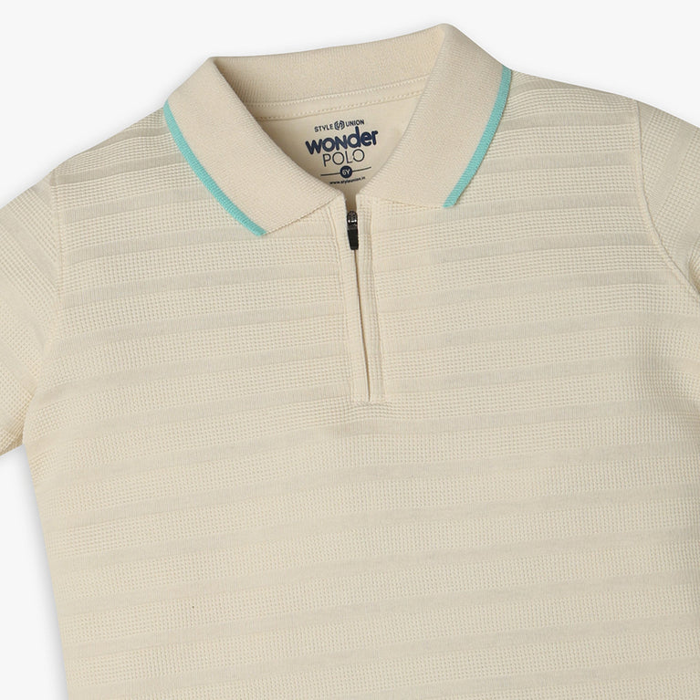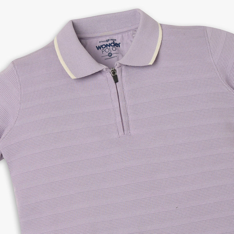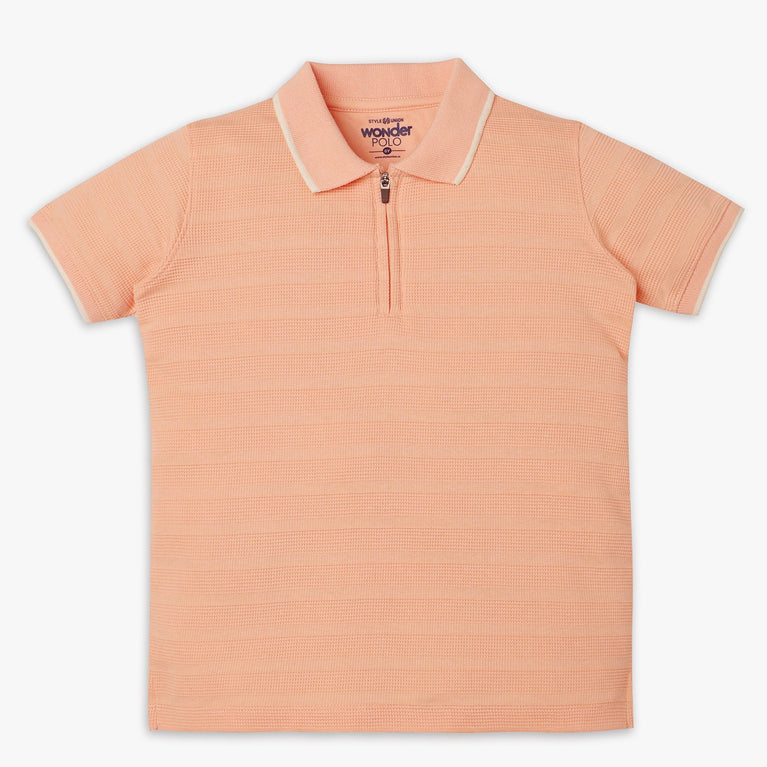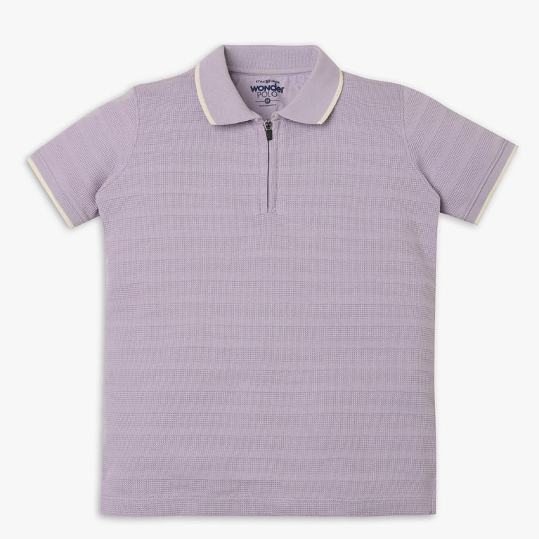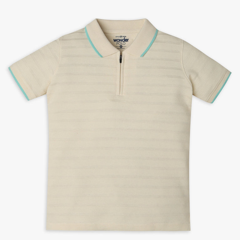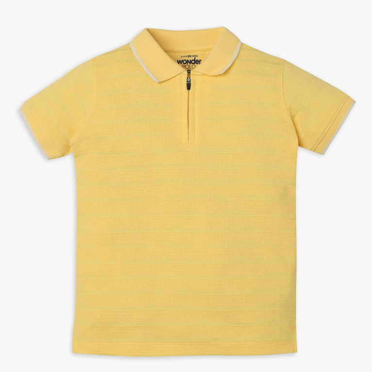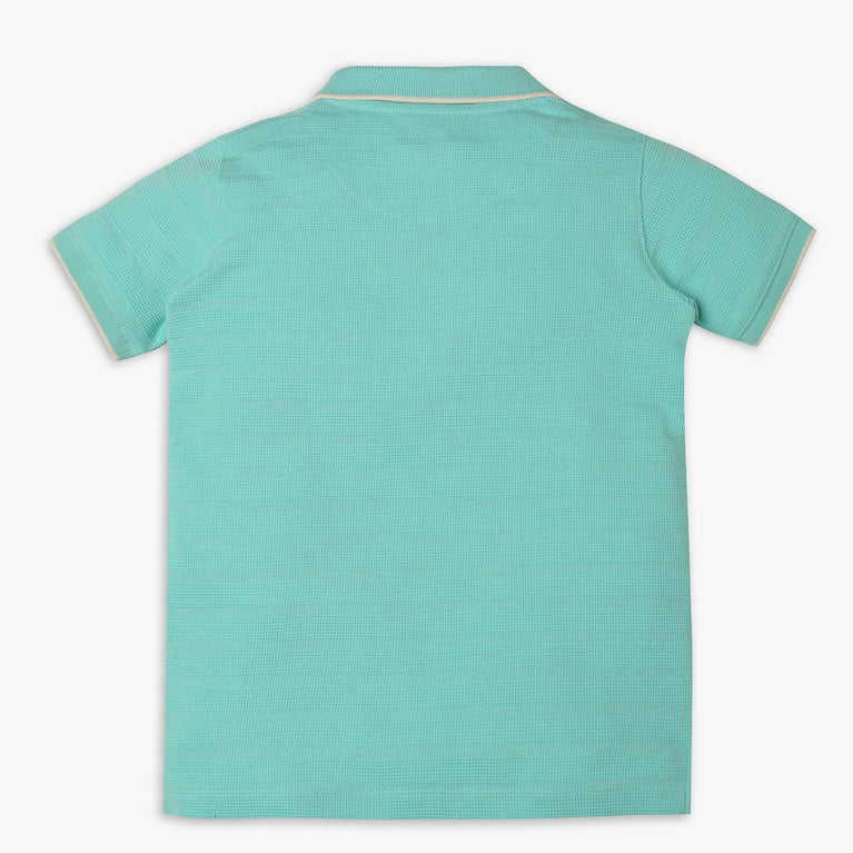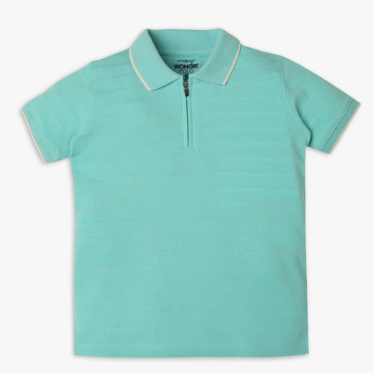 These wonder polo theme, cut and sew pattern t-shirt has polo neck and half sleeve. Made from cotton polyester spandex, your kid's feel comfortable wearing the product.
