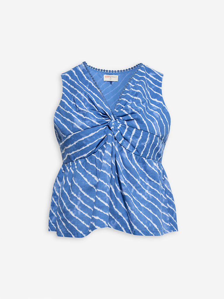 Bombay Paisley Blue Stripes Printed Ruched Cotton Top