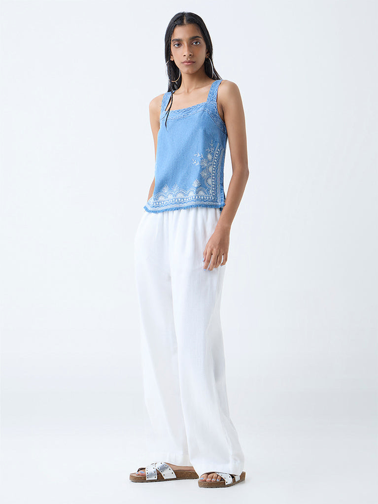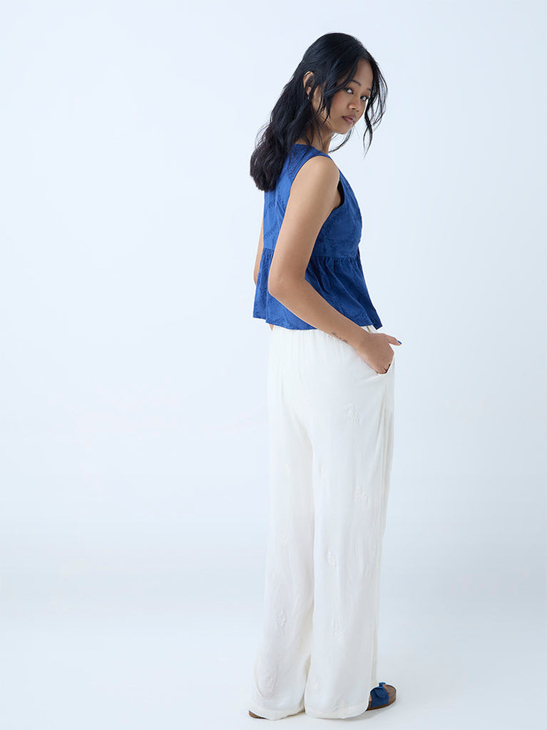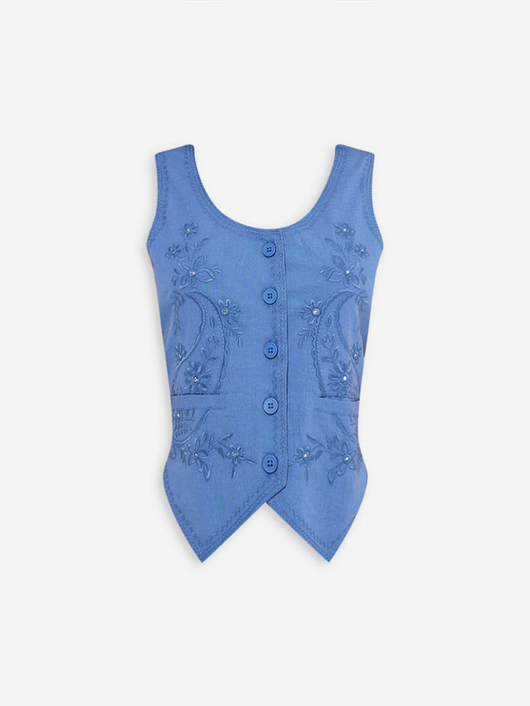 This blue waistcoat-style top from Bombay Paisley showcases intricate paisley embroidery that adds a touch of artisanal elegance. Created from a cotton-rich fabric for luxurious comfort, it features a classic round neck that leads into a button placket, paired with a sleeveless cut for a breezy look.