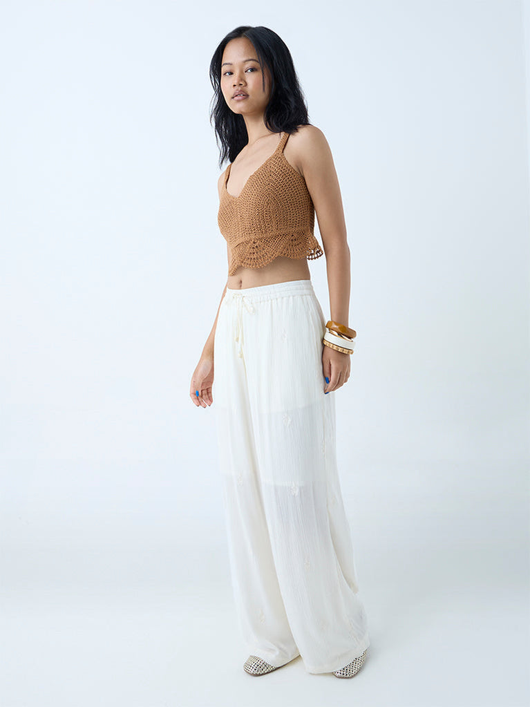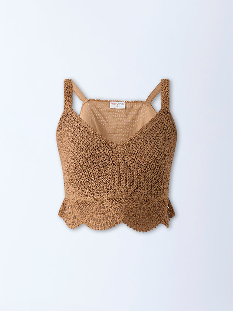 This brown top from Bombay Paisley is elevated with intricate crochet work that lends artisanal charm. Cut in a sleeveless frame with a clean V-neck, it strikes the right balance between casual ease and crafted detail.
