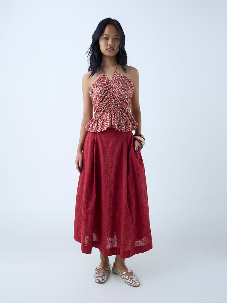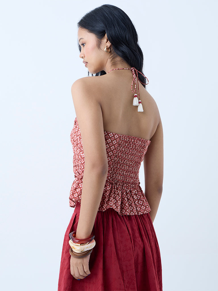 Add a playful twist to your summer edit with this brown top from Bombay Paisley. Constructed from pure cotton, it showcases ruched detailing along the bodice for a contouring fit, while the halter neck ties back with tasselled cords for a touch of flair. The backless design keeps things breezy, and delicate floral motifs lend a feminine finish.