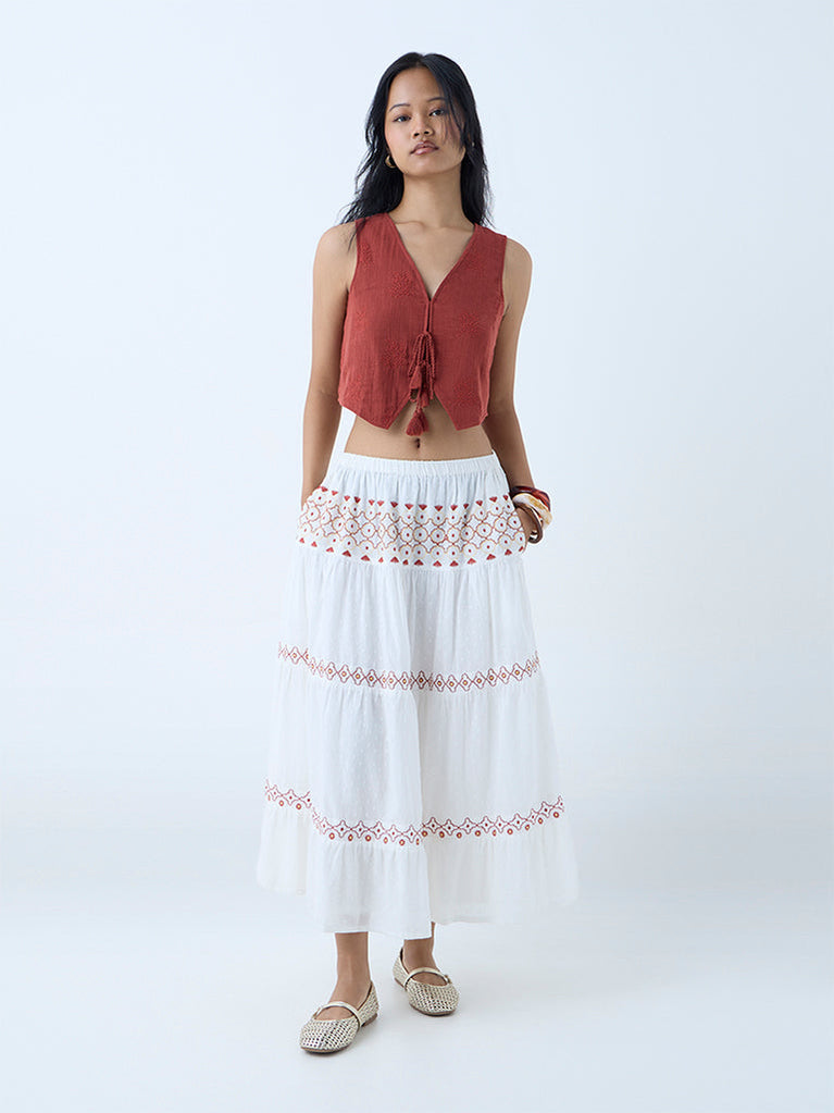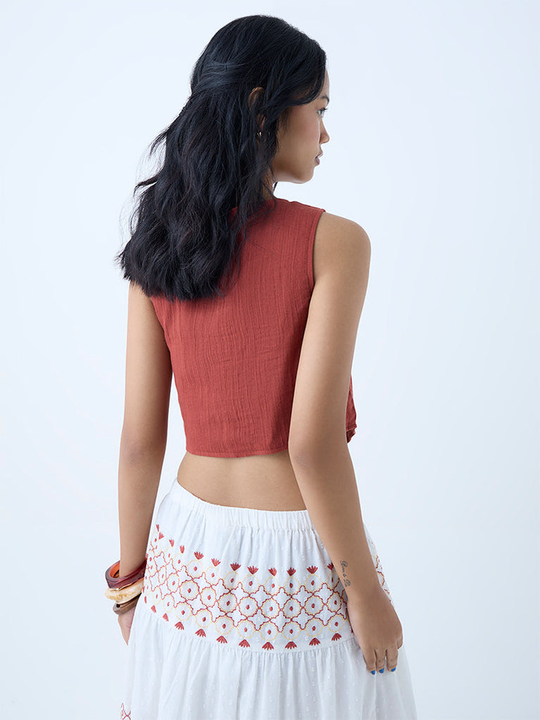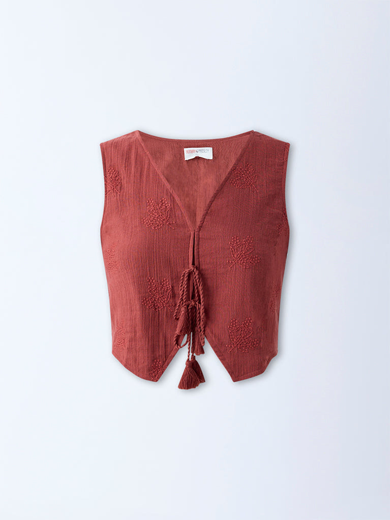 This brown waistcoat from Bombay Paisley blends artisanal detail with a contemporary silhouette. Crafted from soft cotton, it showcases floral embroidery that lends a feminine touch. The V-neck flows into a tie-up front, while the sleeveless cut keeps the look light and layered.