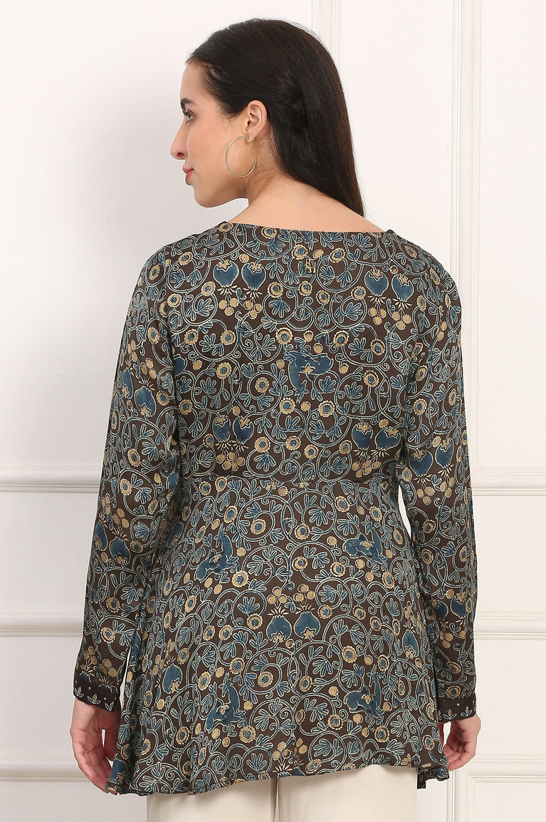 Grace your everyday ethnic wardrobe with this chocolate brown ajrak printed top for women from Folksong. Crafted in sumptuous 100% viscose modal satin, the top brings fluid movement and soft sheen to your casual ensembles. Featuring a timeless round neckline, full-length sleeves, and a straight silhouette, it flatters with ease and understated refinement. The surface is enhanced with delicate thread embroidery over an elegant floral print, giving it a distinct handcrafted appeal. Its mid-thigh length and no-slit design provide modesty with poise, while the button closure adds practicality. Lightweight and versatile, this woven brown ethnic top is a perfect companion for summer styling, pairing effortlessly with straight pants, ethnic skirts, or relaxed denim for an Indo-contemporary look.