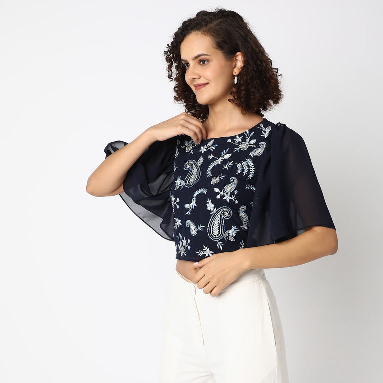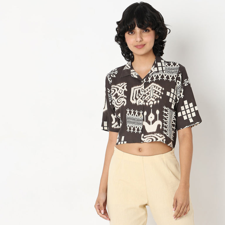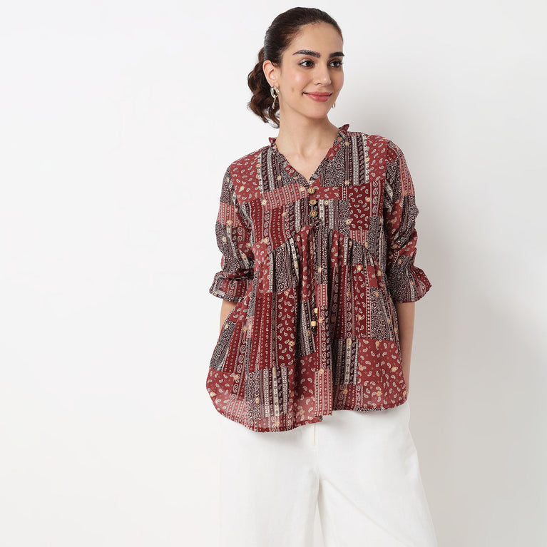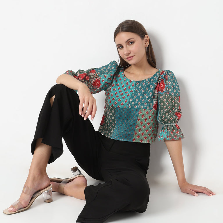 This printed pattern crop top has a v neck and three-fourth sleeve. Made from rayon, it is soft and comfortable to wear.