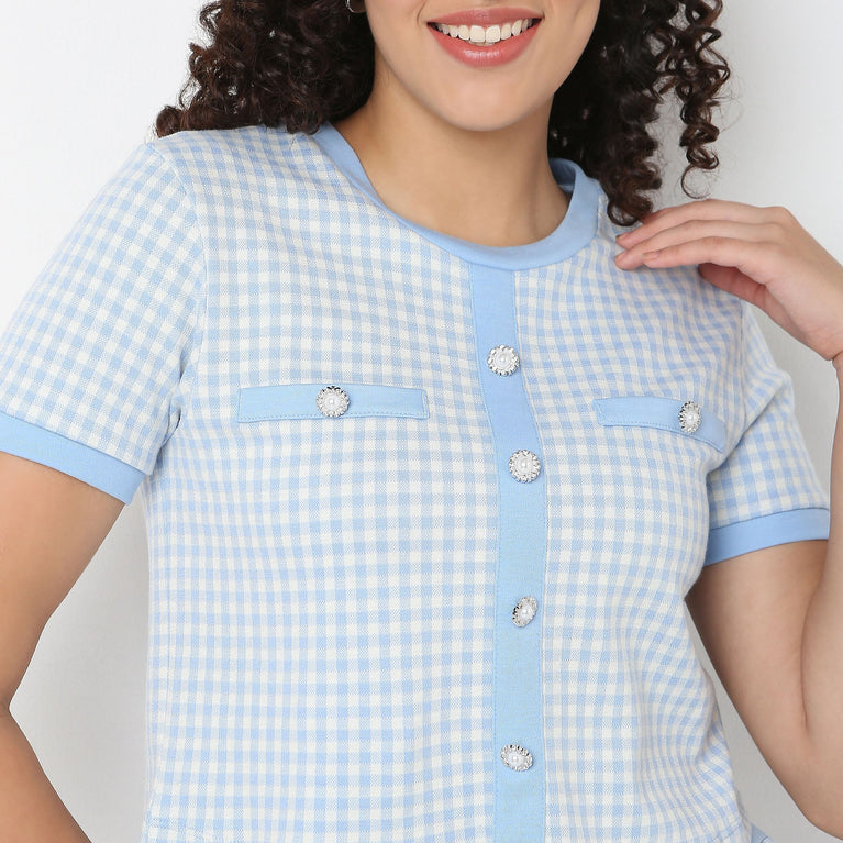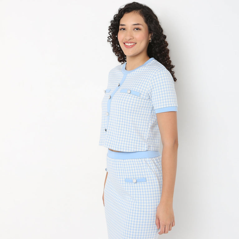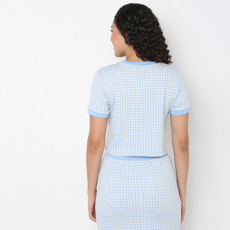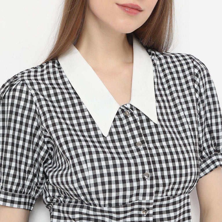 This checkered pattern crop top has a collar and short sleeve. Made from cotton, it is soft and comfortable to wear.
