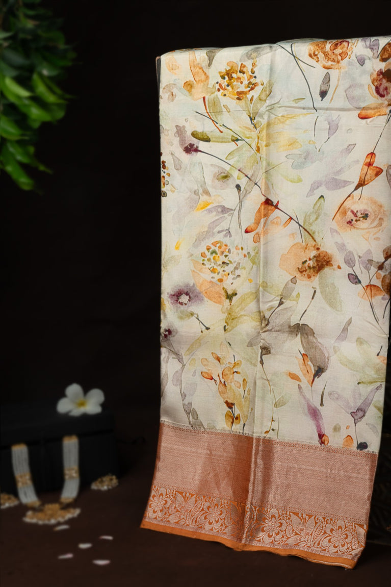 Varamahalakshmi Off White & Light Orange Fancy Digital Print Saree