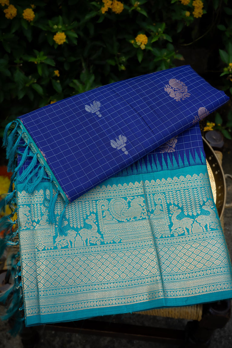 Varamahalakshmi Navy Blue & Sea Green Kuppadam Checks And Buttis Saree