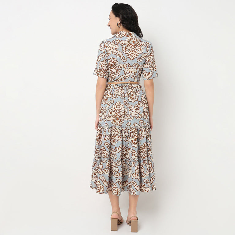 Embrace effortless elegance with the Camp Collar Tiered Floral Dress. Designed for women, this below-knee dress combines a charming floral pattern with a relaxed flare fit, making it perfect for any occasion.