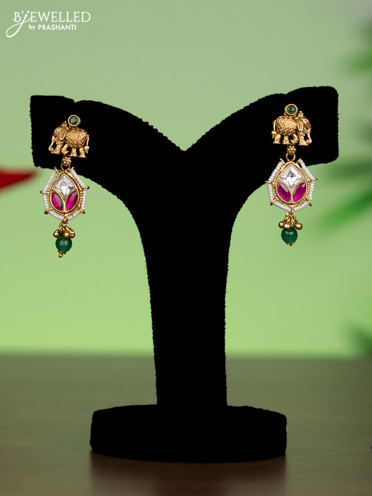 Antique attigai necklace elephant design with pink kemp & kundan stones and green beads hanging