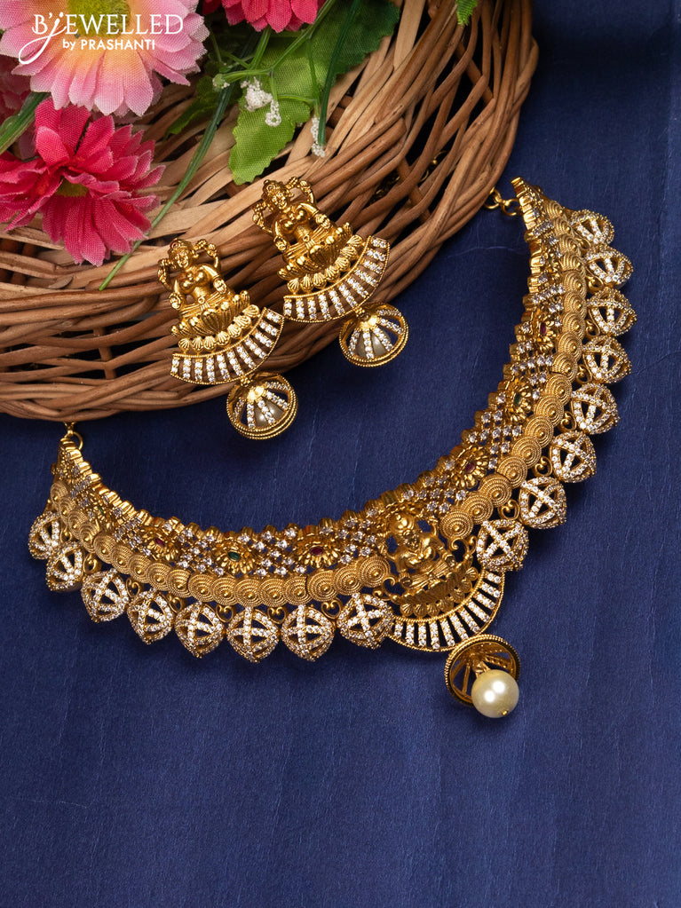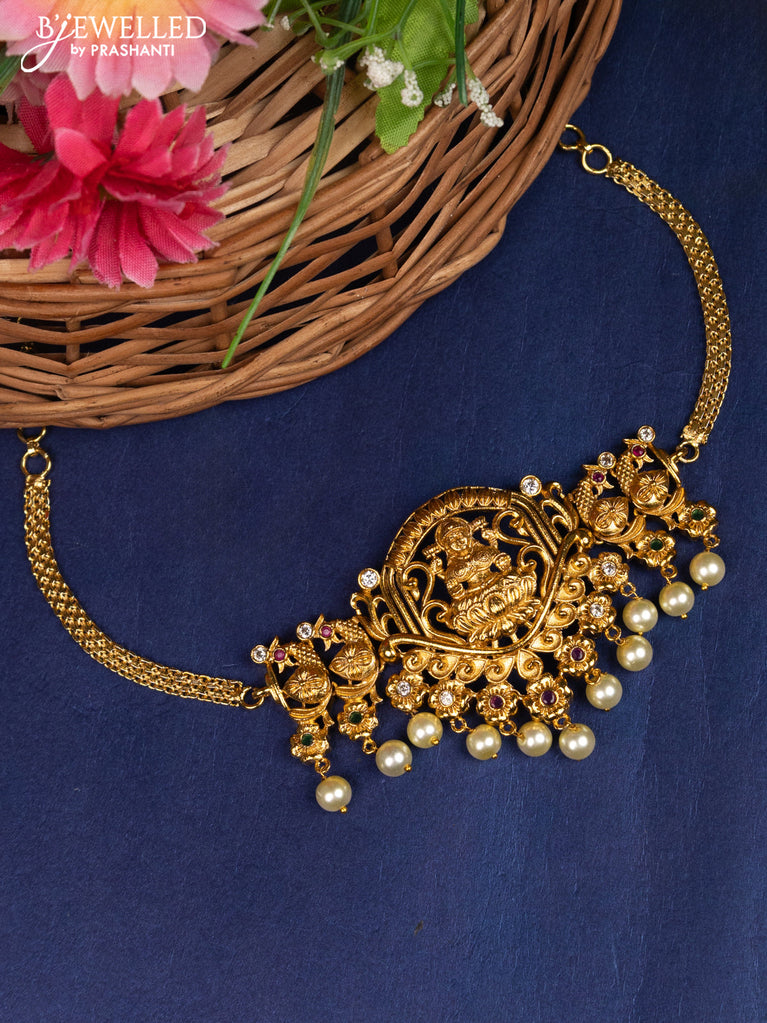 Antique choker lakshmi design with cz stones and pearl & golden beads hanging