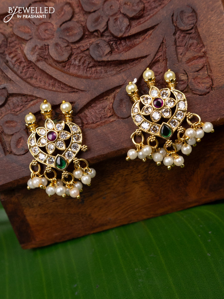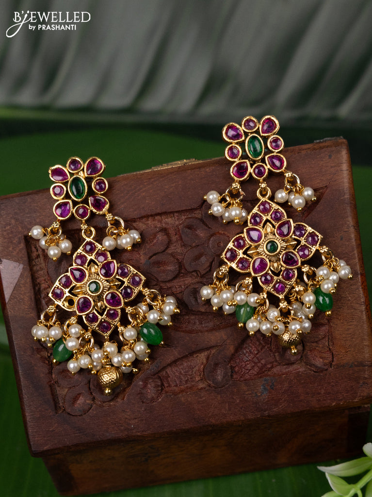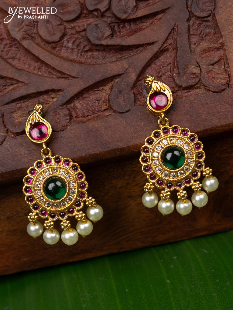Antique earring with pink kemp & cz stones and golden beads hanging